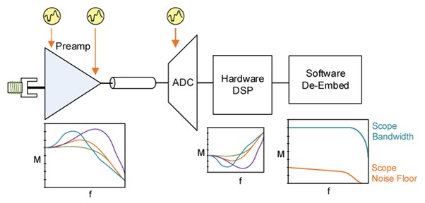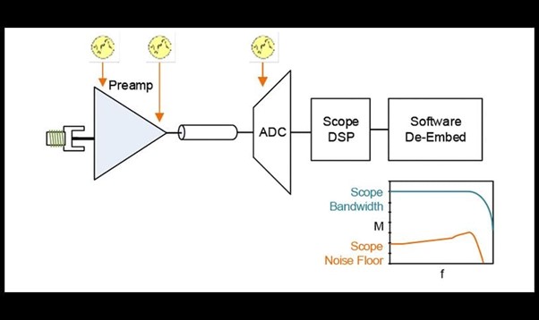 The oscilloscope's preamplifier applies a form of continuous-time linear equalization (CTLE) to boost high-frequency components before digitization. After the ADC, the DSP undoes this equalization, restoring a flat frequency response. This method preserves the signal while shaping the noise floor so that it remains lower at high frequencies.