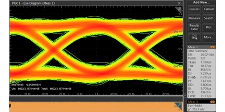 17-inch trace, 20 Gbps data rate. A modest increase in eye pattern height by 3% and width by 1% was observed. This improvement is minor, but sufficient to tip the scales in favor of passing the compliance test.