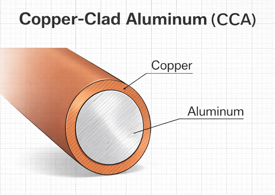 CCA is a composite conductor: an aluminum core with a thin copper coating on the outside. It is lighter and less expensive than copper. Its electrical and mechanical properties, when powered over long distances, are more similar to aluminum than copper: higher resistance for the same cross-sectional area and lower long-term stability under rough handling.