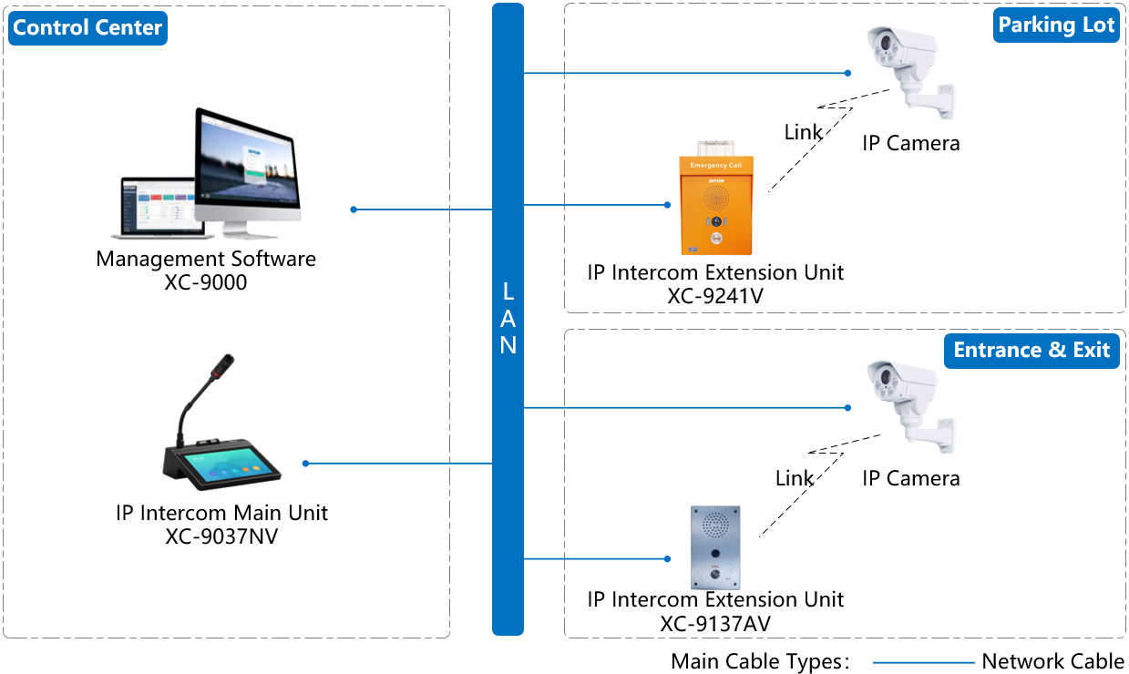 Основанная на технологии сетевой передачи, IP-домофонная система преобразует голосовые сигналы в цифровые и передает их через IP-сеть. В сценарии парковки система в основном состоит из программного обеспечения управления и главного блока IP-домофона, которые установлены в центре управления, а также абонентских блоков IP-домофона, распределенных по парковке и у въездов и выездов.