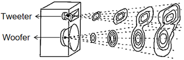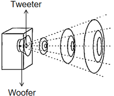 В коаксиальной акустической системе среднебасовый излучатель и твитер расположены на одной оси и выглядят спереди как два концентрических круга — отсюда и название. Коаксиальная акустическая система не является широкополосной; это особый тип полосовой акустической системы, внешне напоминающий широкополосную. Схема расположения твитера и вуфера в коаксиальной акустической системе и принципиальная схема её звуковоспроизведения приведены ниже.