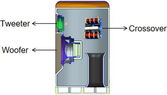 Полосовая акустическая система, как следует из названия, способна делить звук на различные частотные полосы и направлять их на соответствующие громкоговорители , например, твитеры (высокочастотные), среднечастотные динамики и вуферы (низкочастотные) — для воспроизведения. Как правило, звук делится на две или три частотные полосы: две полосы соответствуют двухполосной акустической системе, три — трёхполосной. Внутренняя структура и принципиальная схема воспроизведения звука двухполосной акустической системы приведены ниже.